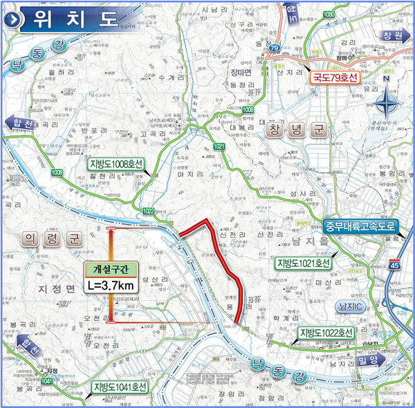 ▲ 창녕 남지읍 용산~아지간 도로 위치도경상남도는 창녕군 남지읍 용산리와 창아지리를 연결하는 지방도 1022호선(남지~교동)인 용산~아지 간 도로 개설공사를 착공한다.