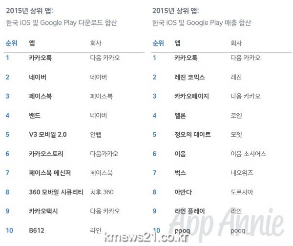 앱애니의 2015년 Retrospective 보고서에 따르면 한국은 전세계 앱 시장 국가별 순위에서 Google Play 매출 기준 3위, 다운로드 기준 8위, iOS 매출 기준 8위를 기록했다.