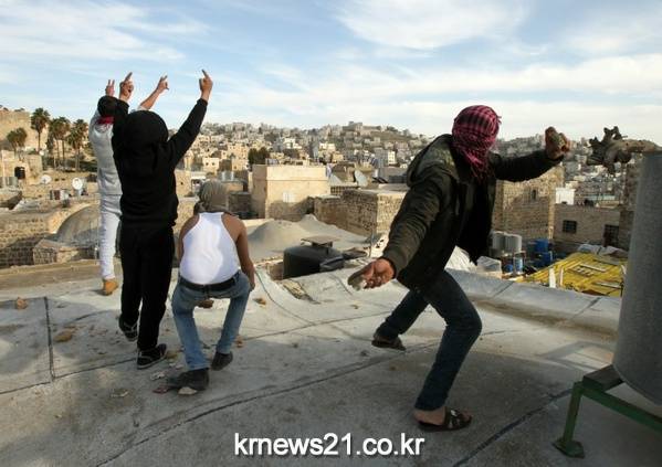 ▲ ⓒAFP / Hazem Bader팔레스타인 자치구인 서안지구의 헤브론 도시에서 21일(현지시간) 네 명의 팔레스타인 사람들이 이스라엘 정착민이 거주하는 쪽을 향해 돌을 던지고 있다.