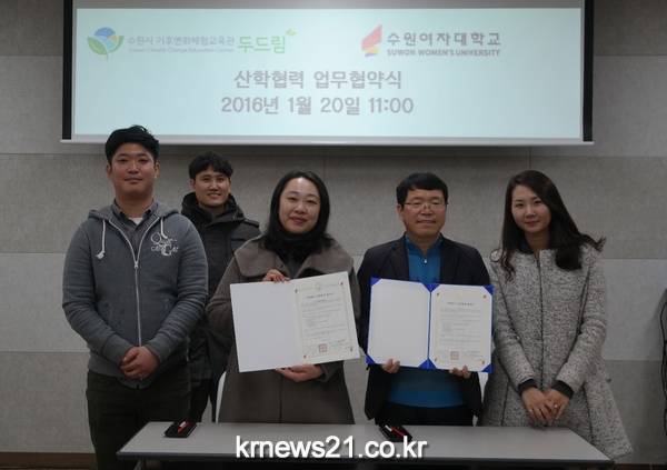 수원시기후변화체험교육관과 수원여자대학교 레저 스포츠과는 업무협약을 통해 ‘산학 공동 연구 개발 및 맞춤형 교육과정 개발’등에 함께 노력할 예정이다