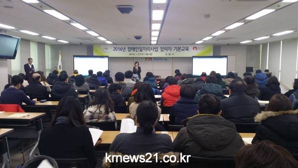 수원시는 지난 27일 시청 중 회의실에서 장애인일자리사업 참여자 90여명을 대상으로 2016년 장애인일자리사업 참여자 기본교육을 실시했다.