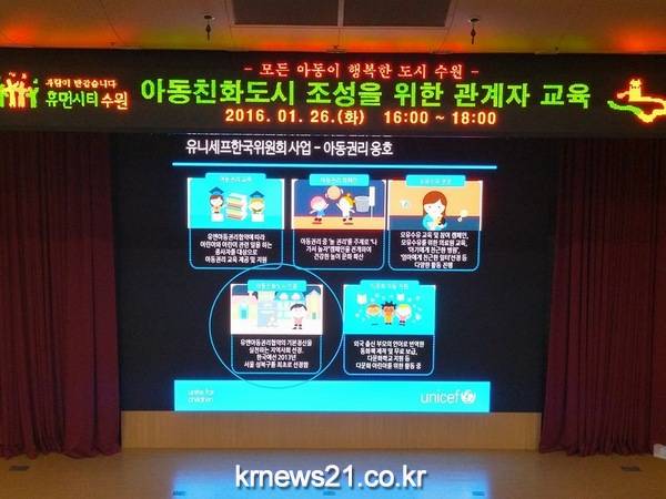 수원시는 지난 26일 시청 대강당에서 아동친화도시(CFC:Child Friendly Cities) 수원 조성을 위해 공직자 및 아동 관계자 200여명을 대상으로 교육을 실시했다.