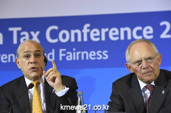 앙헬 구리아 OECD 사무총장(왼)과 볼프강 쇼이블레 독일 재무장관(오)