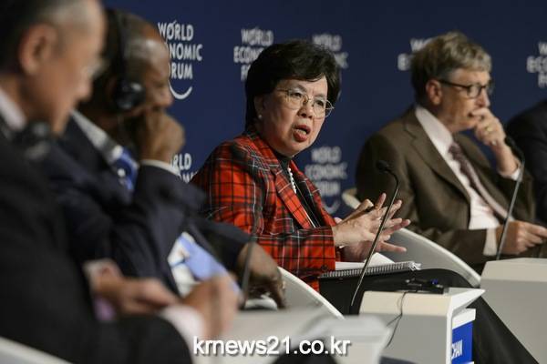 ▲ ⓒFABRICE COFFRINI / AFP1월 22일 다보스 포럼에 참석한 마거릿 챈 WHO 사무총장 (왼쪽에서 3번째)