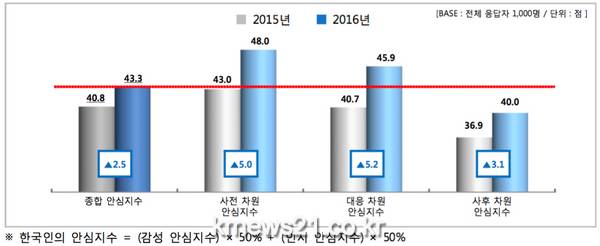 2016년 한국인의 안심수준은 43.3점. 지난해보다 2.5점 상승했으나 여전히 불안과 걱정 많아 한국인의 안심수준은 43.3점으로 여전히 낮은 수준으로 나타났다(2015년 40.8점, 2.5점 상승).