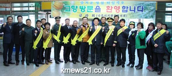 강인규 나주시장을 비롯한 나주시 기관단체장으로 구성된 금라회 회원들은 6일 오전 9시부터 나주역 대합실에서 기관단체장 및 임직원과 공무원 등 50여명이 참석한 가운데 설 명절을 맞아 고향을 방문하는 귀성객과 서울로 상경하는 역귀성객을 대상으로 환영 및 배웅행사를 가졌다. <사진>