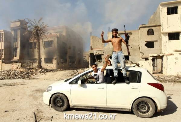 리비아 친정부 민병대원들이 지하디스트들의 주요 거점이던 벵가지 지역의 탈환을 기뻐하고 있다.