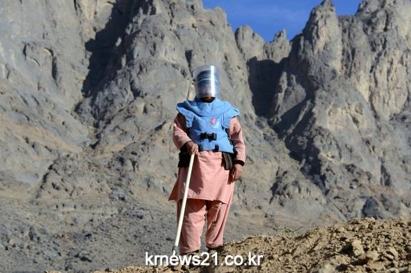 아프간 남부 도시 칸다하르에서 지뢰 제거를 하는 사람이 언덕위에 서 있다.