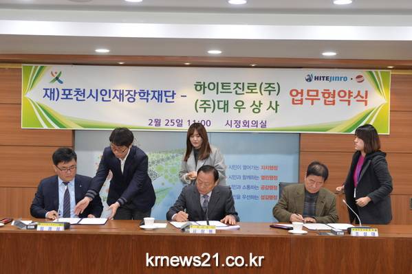 지역인재 발굴 및 육성을 위해 운영하고 있는 재단법인 포천시인재장학재단(이사장 서장원)는 지난 2월 25일(목) 하이트진로㈜ 및 ㈜대우상사와 지역학생들의 장학금 지원을 위한 업무협약을 체결했다.