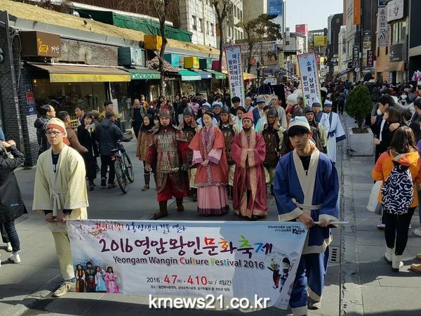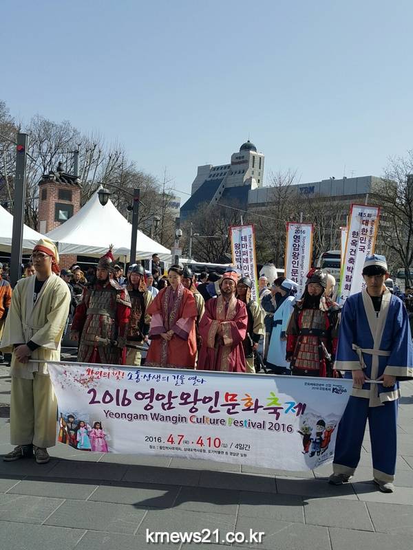 영암군이 4월 7일부터 10일까지 펼쳐지는‘2016 영암왕인문화축제’를 알리기 위해 왕인박사의 행적 중 가장 상징적인 사실인 천자문을 가지고 일본으로 가는 역사를 재현한 것으로 영암군민이 직접 참여하여 왕인박사, 왕인부인, 도선국사 등의 의상을 착용하고 캐릭터 퍼포먼스 팀‘왕인과 친구들’과 함께 열띤 홍보활동을 펼친 것이다.