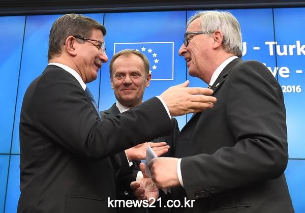 ▲ ⓒEMMANUEL DUNAND / AFP아흐메트 다우토을루 터키 총리(왼), 도날드 투스크 EU 상임의장(가운데), 장 크롤드 융커 EU 위원장(오)
