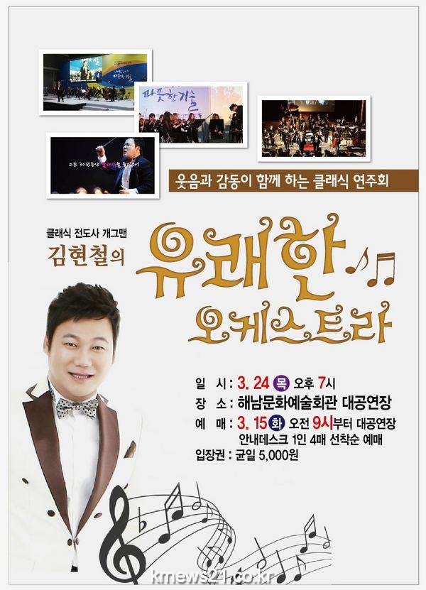 해남군(군수 박철환)은 오는 3월 24일 해남문화예술회관 대공연장에서 ‘개그맨 김현철의 유쾌한 오케스트라’ 공연을 개최한다.