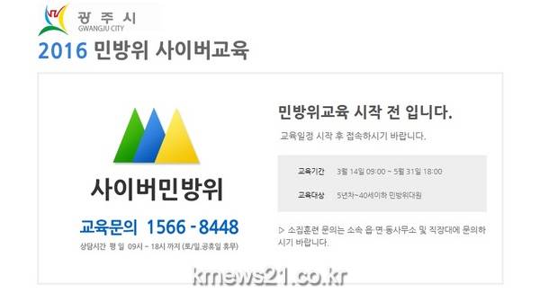 광주시는 오는 14일부터 5월 31일까지 관내 거주하는 5년차 이상 지역․민방위대원을 대상으로 ‘2016년 민방위 사이버 교육’을 실시한다.