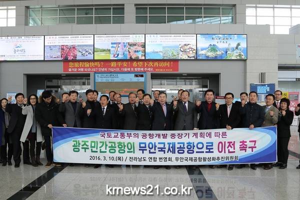 무안국제공항활성화위원회(위원장 박일상, 이하 위원회)는 10일 무안국제공항에서 전라남도 번영연합회와 함께 50여명이 참여해 ‘광주공항의 무안국제공항 이전’과 ‘호남선 KTX 2단계(광주송정-목포) 노선의 무안국제공항 경유’등 무안국제공항 활성화를 위해 국토교통부와 기획재정부가 적극적으로 대책을 마련해줄 것을 촉구했다.
