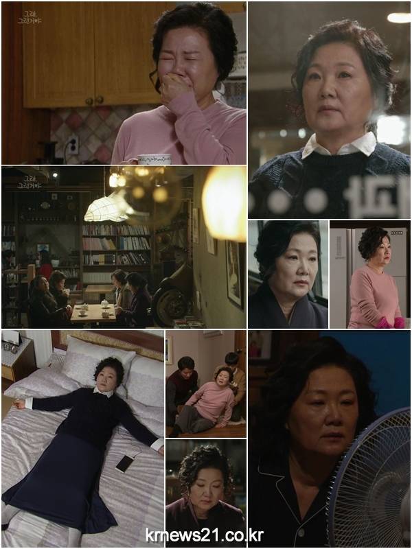 돌아가신 엄마가 착하다고 좋아하셨던 유서방은 착하기는 개뿔. 보기 싫어 나가랬더니 나가서 아예 날 잊어버렸나 보다. 딸년도 아들 녀석도 두 시간 째 한번 들여다를 안 본다. 엄마 돌아가시고 나니 각각 살기 바쁜 친정 형제도 점점 멀어지고... 엄마 나 막내가 속 썩여요. 엄마 나 다쳐서 아파요. 엄마 나 너무 힘들어요...(7회, 아들 정해인의 취포자 선언과 꼬리뼈 부상으로 불편한 몸과 마음을 가족들 누구도 알아주지 않자, 약을 먹으며 서러움에 복받쳐)