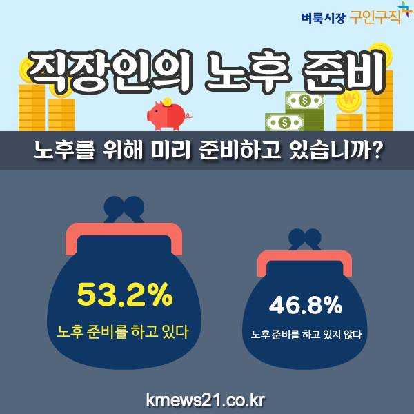 신문, 인터넷, 모바일로 구인구직정보를 제공하는 벼룩시장구인구직(대표이사 최인녕, job.findall.co.kr)이 직장인 564명을 대상으로 직장인의 노후 준비에 대한 설문조사 한 결과 응답자의 절반 이상인 53.2%가 ‘노후 준비를 하고 있다’고 답했다.