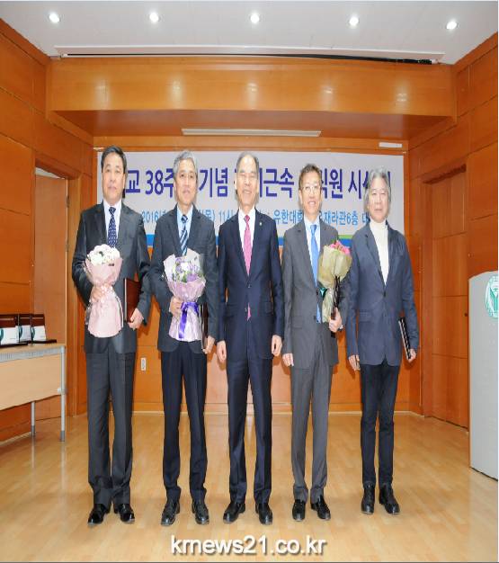 이날 근속상 시상 및 우수교원에 대한 시상식에는 공로패 및 꽃다발 증정, 이권현 총장 기념사에 이어 기념촬영 등의 순으로 진행됐다.