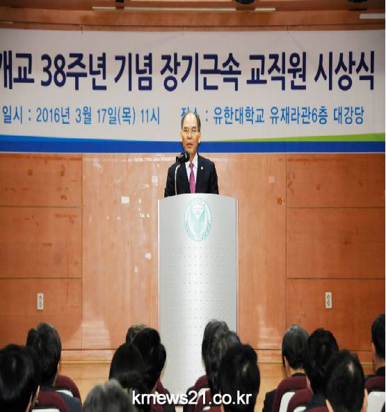 학교법인 유한학원(이사장 유도재) · 유한대학교(총장 이권현)는 개교 제38주년 기념일을 맞이하여근속상 시상 및 우수교원(산학협력교원 및 산학협력중점교원)에 대한 시상식을 3월 17일(목) 유재라관 6층 대강당에서 진행하였다.