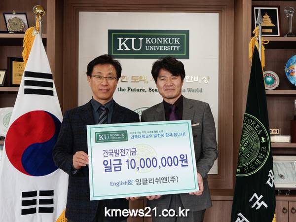 건국대학교 글로컬캠퍼스는 영어교육기업 잉글리쉬앤(주)(대표이사 박성호)가 학교 발전기금으로 1,000만원을 기부했다고 18일 밝혔다.