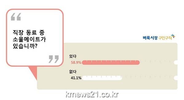 신문, 인터넷, 모바일로 구인구직정보를 제공하는 벼룩시장구인구직(대표이사 최인녕)이 자사 소셜네트워크를 방문한 직장인 564명을 대상으로 ‘직장 내 소울메이트’에 대해 설문조사를 한 결과 과반수가 넘는 58.9%가 ‘소울메이트가 있다’고 답했다.