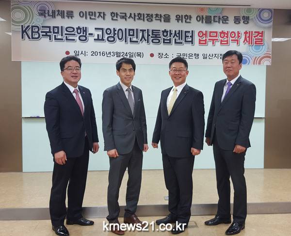 KB국민은행 일산지점(지점장 박종욱)은 고양이민자통합센터(센터장 김세영)와 24일 업무협약을 체결하고 고양시, 파주시 2만여명 되는 국내체류 이민자 및 다문화가정의 한국사회 정착을 위해 아낌없는 지원을 하기로 하였다.