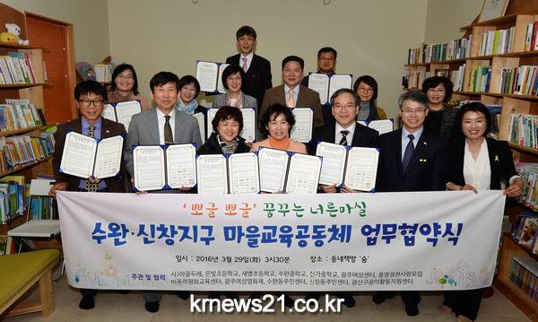 학교, 공공기관, 지역단체 등 12개 기관이 협약을 맺고 수완·신창 권역에 마을교육공동체를 구현하는 사업에 나선다. 지난 29일 수완동 동네책방 ‘숨’에서 가진 협약식에는 새별초등학교, 은빛초등학교, 신가중학교, 수완중학교, 수완동주민센터, 신창동주민센터, 공익활동지원센터, 사)마을두레, 광주여성센터, 풍영정천사랑모임, 비폭력평화교육센터, 광주여성영화제 대표가 참석해 협약서에 서명했다.