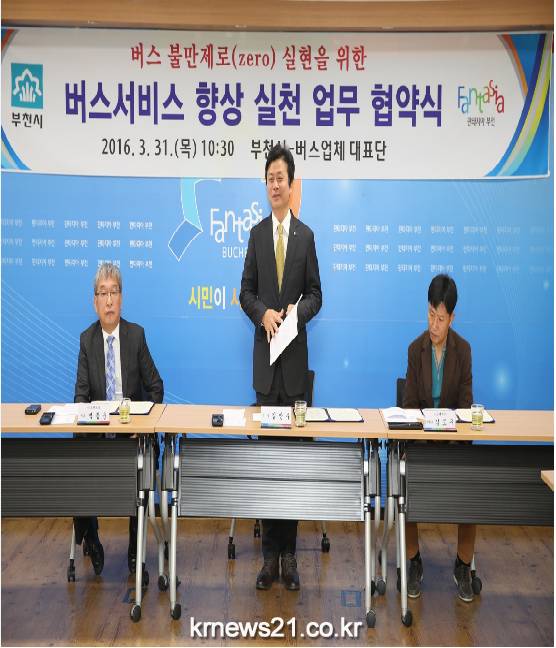 부천시는 관내 버스운수업체와 31일 시청 만남실에서 버스 불만제로(ZERO) 실현을 위한 업무협약을 맺었다.