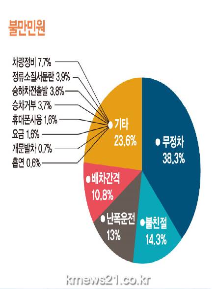민원현상을 살펴보면 무정차 민원이 38.3%로 가장 많았고, 그다음으로 불친절(14.3%), 난폭운전(13.0%), 배차간격 미준수(10.8%) 순으로 조사됐다.