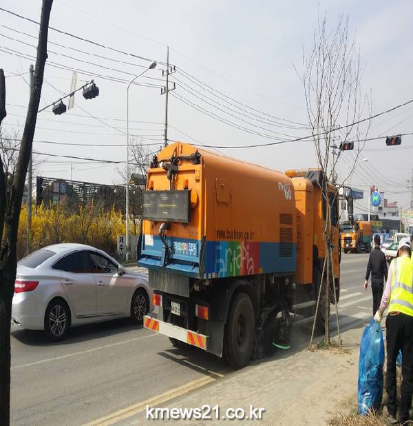 특히 대형차량의 운행이 잦고 농지가 인접한 오정구 도로노면을 청소하고 살수청소에 주력했다.