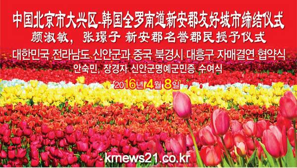 신안군은 오는 4월 8일 개최하는 임자 튤립축제에 중국 북경 대흥구 정부관계자를 초청 자매결연을 체결한다고 밝혔다.