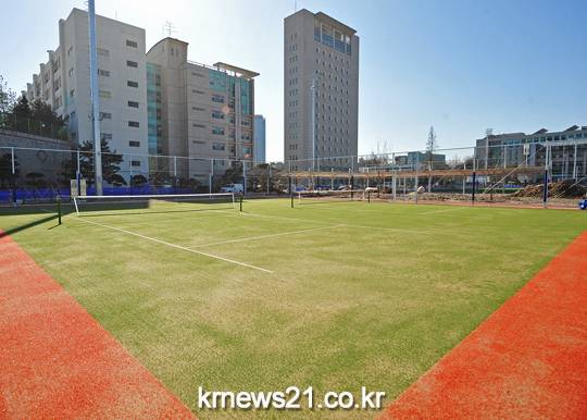 체육광장 바로 옆에 노후화되어 사용하지 않던 테니스장 2개면도 우레탄 바닥을 걷어내고 새롭게 인조잔디 코트를 조성했다.