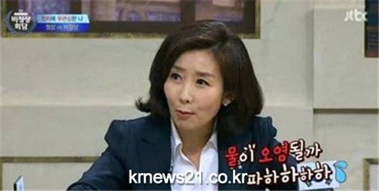 나경원 새누리당 의원은 1월 JTBC ‘비정상회담’에 출연해 패널들과 열띤 토론을 펼치며 입담을 뽐냈다. 각 국가를 대표하는 패널들이 정치인들을 소재로 한 농담을 소개하던 시간이었다. 나 의원 역시 한국의 정치 농담을 소개하며 “정치인이 한강에 빠지면 구할 거냐, 말 거냐”라는 질문을 던졌다. 이어지는 나 의원의 답변은 ‘셀프 디스’에 가까웠다. 나 의원은 “빨리 구해야 한다. 물이 오염된다”고 말해 폭소 아닌 폭소를 자아냈다. 나 의원은 제20대 국회의원선거에서 서울 동작구 을 새누리당 후보로 나섰다.