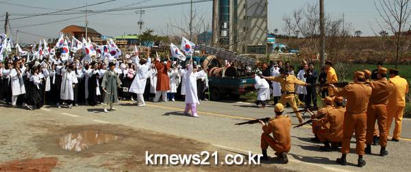 이들은 당시 복장으로 “대한독립만세”를 외치며 일본헌병 분소를 기습적으로 방화하는 당시 상황을 생생하게 재연했다.