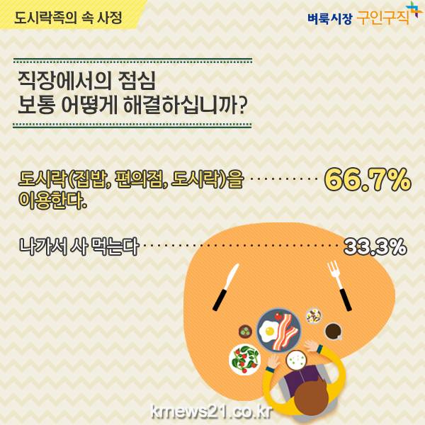 신문, 인터넷, 모바일로 구인구직정보를 제공하는 벼룩시장구인구직(대표이사 최인녕)이 직장인 639명을 대상으로 ‘직장인 도시락족의 속사정’에 대해 설문조사를 진행한 결과, 과반수를 훨씬 넘는 66.7%의 직장인이 직장에서 점심으로 ‘도시락(집밥, 편의점 도시락 등)을 이용한다’고 답한 것으로 조사되었다. 성별로는 남성(33.8%%) 보다는 여성(66.2%%)이 연령별로는 30대(39.4%)가 도시락 이용이 많았다.