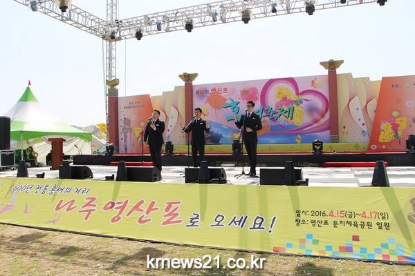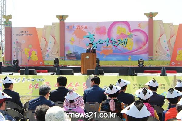 강인규 나주시장이 15일 개막한 ‘제12회 영산포 홍어 축제’에서 축사를 하고 있다. 나주시립국악단의 식전 공연행사 모습.