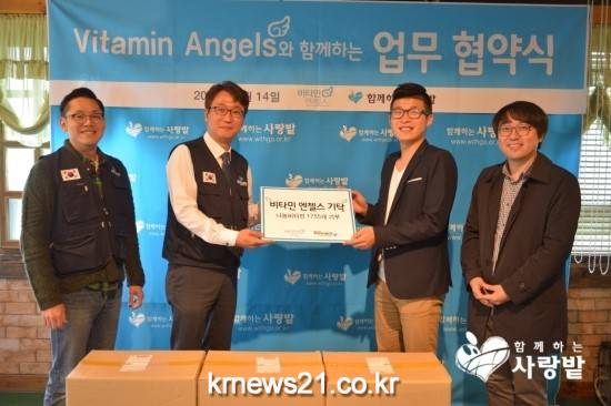 이날 비타민 엔젤스는 복지사각지대에 있는 국내외 이웃들을 돕는 함께하는 사랑밭과 나눔 협약을 맺고 미혼모 등 소외 이웃들을 위해 15박스의 비타민(2,970만 원 상당)을 기부하였다.