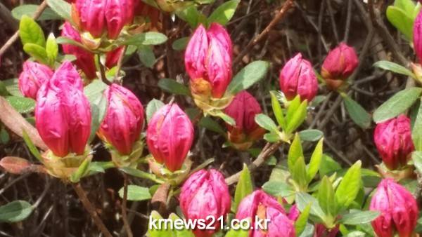 철쭉은 5월에 피고 연분홍색이며 3∼7개씩 가지 끝에 산형꽃차례를 이룬다. 꽃받침은 작은꽃줄기와 더불어 선모가 있다. 화관은 깔때기 모양이고 5개로 갈라지며 위쪽 갈래조각에 적갈색 반점이 있다. 수술은 10개, 암술은 1개이며 씨방에 선모가 있다.