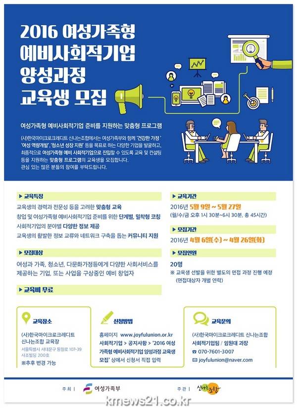 여성가족부와 (사)한국마이크로크레디트 신나는조합이 5월 9일부터 3주간 ‘2016년 여성가족형 예비사회적기업 양성과정’을 운영한다.