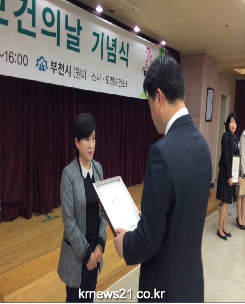 부천 근로자건강센터(센터장 정혜선) 김금옥 부장이 ‘제44회 보건의 날’을 맞아 지역보건의료발전에 기여한 공으로 부천시장 표창장을 수여했다."고 밝혔다.