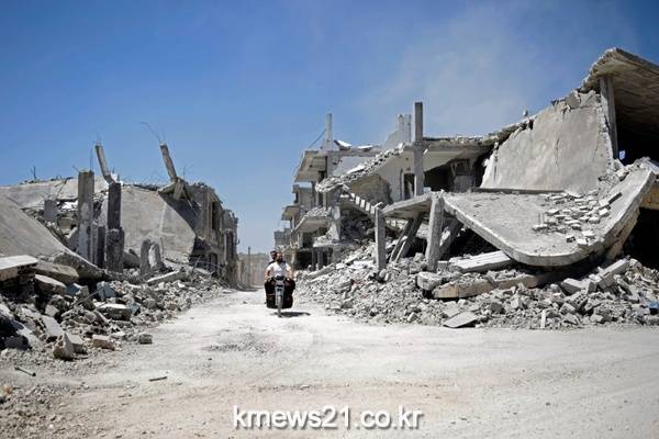 시리아 서부도시인 홈스의 한 마을이 공습으로 무너졌다. 잔해 사이로 한 남자가 오토바이를 타고 이동하고 있다.