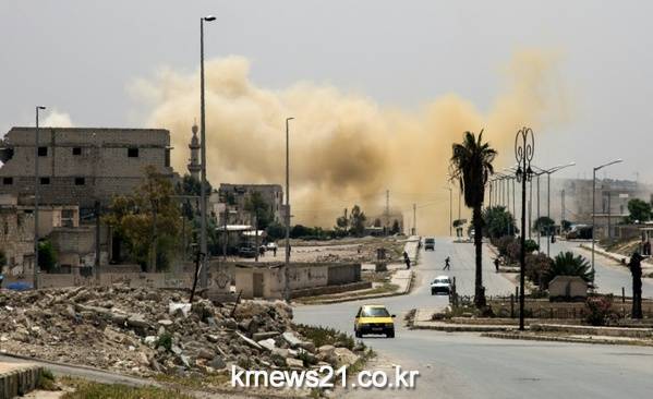 시리아 북쪽 알레포와 가까운 살리힌 지역에 공습으로 연기가 올라오고 있다.