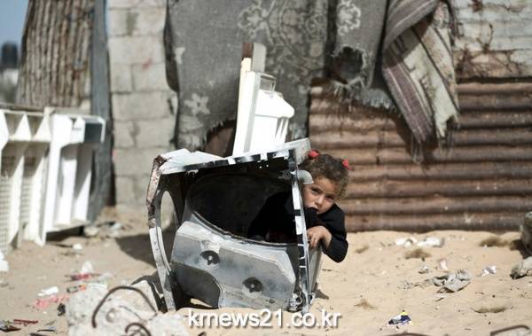 팔레스타인 소녀가 가자 지구 남부 지역에서 파편을 가지고 놀고 있다.