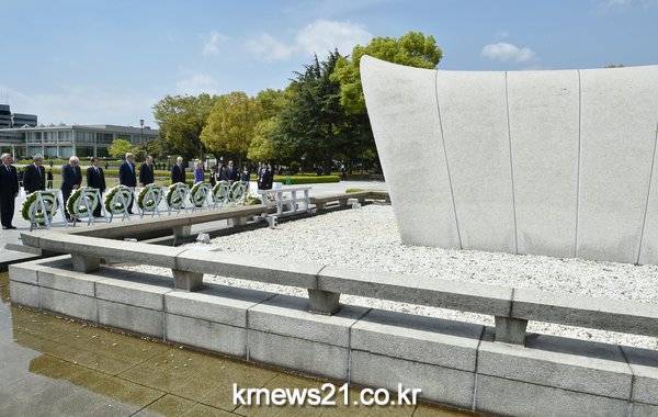 ▲ ⓒKazuhiro NOGI / POOL / AFP지난 4월 11일 히로시마 평화공원 희생자 위령비에 헌화하는 G7 외무장관