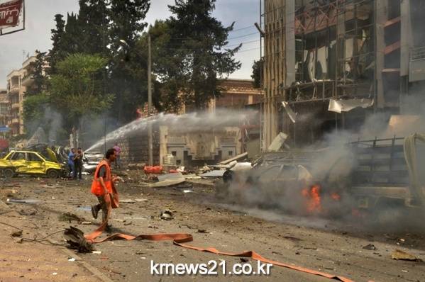 시리아 알레포에서 반군이 정부군이 장악하고 있는 지역을 공격했다. 연기가 나는 병원 건물과 앞에 있는 차를 향해 응급요원들이 물을 뿌리고 있다.
