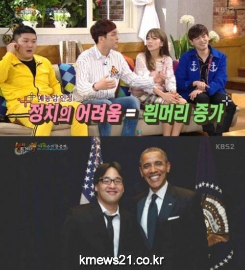 이어 한희준은 "정치적 발언은 하지 말라고 했는데 내가 '요즘 정치가 많이 힘드신가봐요'라고 했다. 이 말에 경호원들이 긴장하기 시작했다"며 "내가 '흰 머리가 많이 나셨어요'라고 말했더니 오바마 대통령이 빵 터졌다. 말도 안되는 한국 개그인데 미국에서 빵 터지는 것이었다"고 설명했다.