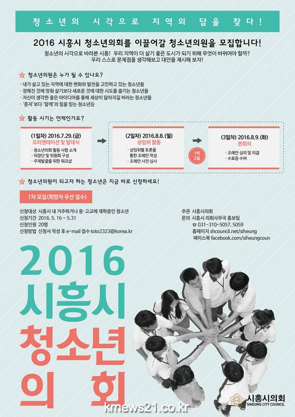 경기 시흥시의회(의장 윤태학)가 ‘2016 시흥시 청소년의회’에 참여할 의원을 공개모집한다.