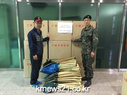 시는 이번에 산불 초동진화와 잔불정리에 효과적인 수동식 등짐펌프(60), 삽(40), 갈퀴(60) 등 산불진화장비 3종 160점을 지원해 부대 인근 산불 발생 시 신속하고 효과적인 산불초동진화 작업에 투입될 예정이다.