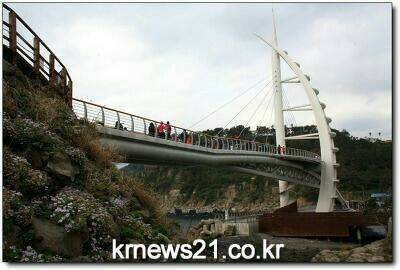 새연교는 서귀포항 바로 남쪽에 위치한 무인도인 새섬과 육지를 잇는 길이 169m, 폭 4∼7m의 사장교이다.