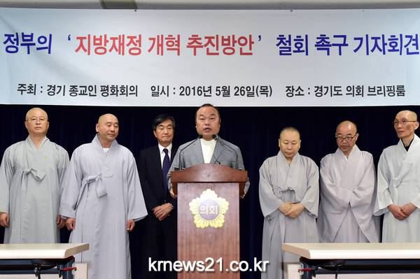 경기도 내 7개 종단 성직자들의 모임인 경기종교인평화회의(KCRP)는 26일 경기도의회 브리핑 룸에서 기자회견을 갖고 개편안 철회를 촉구했다.
