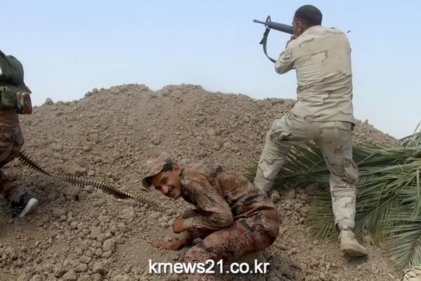 이라크 친정부 세력이 유프라테스 강 근처 팔루자 남부 영역의 최전선에서 총을 발사하고 있다.